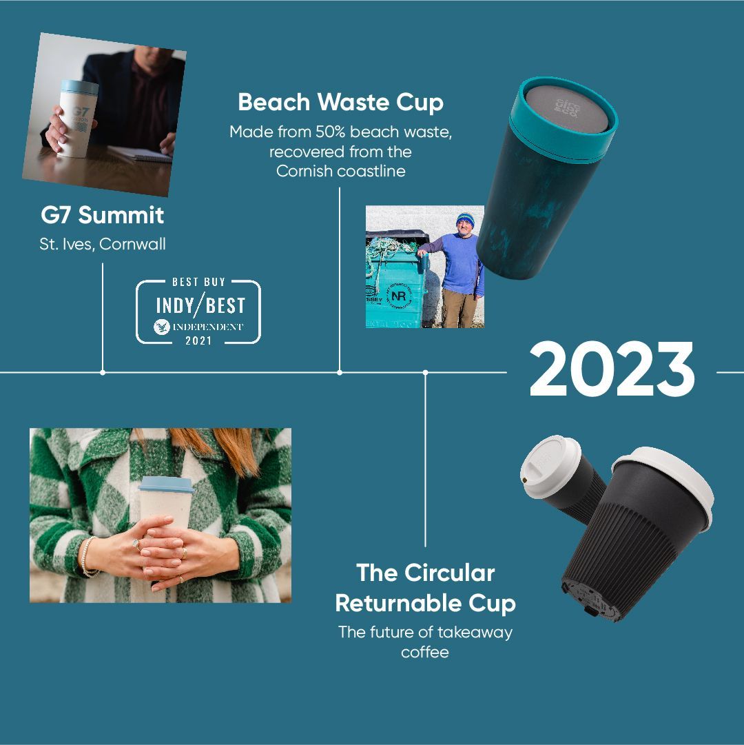 2022: In 2022, the Circular team worked closely with waste collection organisations and beach clean charities to produce the Beach Waste Circular Cup, this was such a hit that we sold out of the initial limited edition and brought it into our core product range. There is now a clear economic supply chain for beach waste!